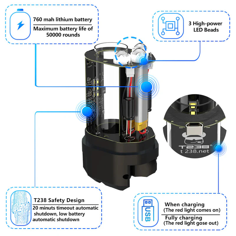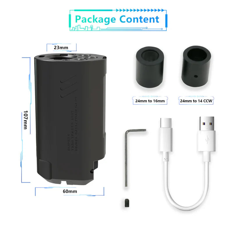 Specification: Dimensions: 105X60X45mm outer diameter and 23mm inner diameter Interface: 19-24mm, with 24mm to 14 CCW and 24mm to 16mm adapters Functions: Rainbow tracer mode, dynamic gunfire colour, tracer BBs/Gel balls charging, adjustable gunfire colour, 20 minute timeout automatic shutdown, low battery automatic shutdown Supported rate of fire: max.50rps Supported projectile types: spherical projectile with 6-22.5 outer diameter Battery: 1000mah, maximum endurance 100000 rounds, charging with Micro USB cable Included:- Tracer Unit