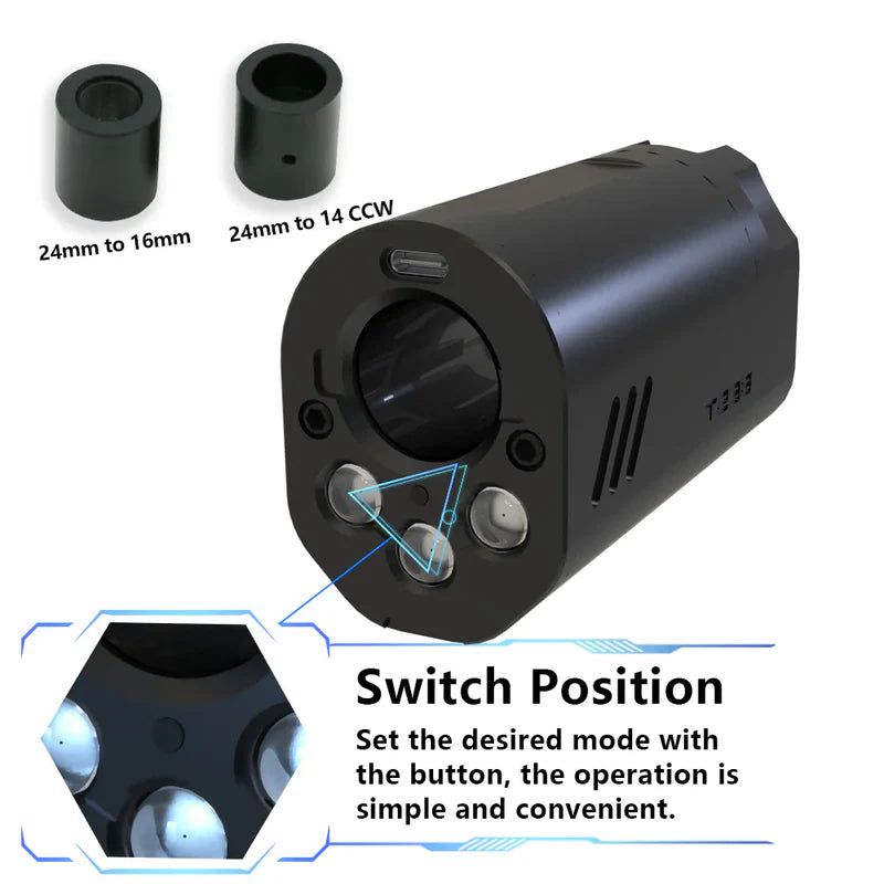 Rainbow Burst+ is an RGB+ tracer unit designed for the AIROFT shotguns. It has the luminous bullet charging function and the gunfire simulation function. It can light the special luminous bullets passing through the tracer. Three high-power LED light bulbs can simulate a variety of gunfire colours, such as rainbow colour, dynamic colour change, etc. It can still light the bullet's flight path when using ordinary bullets. The inner diameter is 23mm, and it supports an external barrel of 19-24mm, With 14CCW and 16mm interface adapters. Due to its strong passing ability, Rainbow Burst+ can also be used in the Gel Ball Blaster and Foam Dart Blaster.