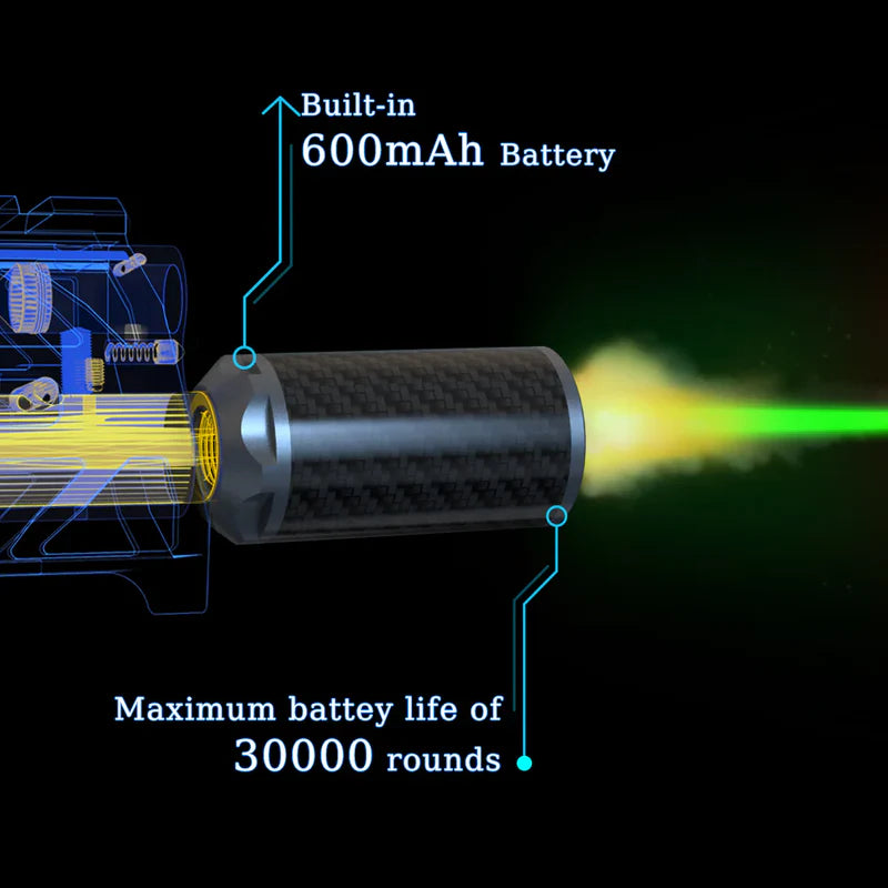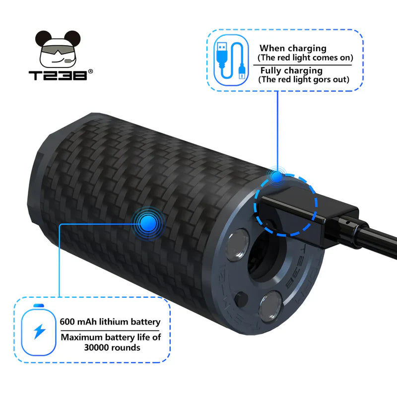 Dimensions: 64mm long, 32mm outer diameter and 11mm inner diameter Weight: 70g Interface: 14 CCW Functions: tracer BBs/Gel balls charging, gunfire simulation,20 minute timeout automatic shutdown, low battery automatic shutdown Supported rate of fire: max. 50rps Supported projectile types: spherical projectile and cylindrical strip projectile with 6-11 outer diameter Battery: 600mah,maximumen durance 30000 rounds, charging with TYPE-C cable