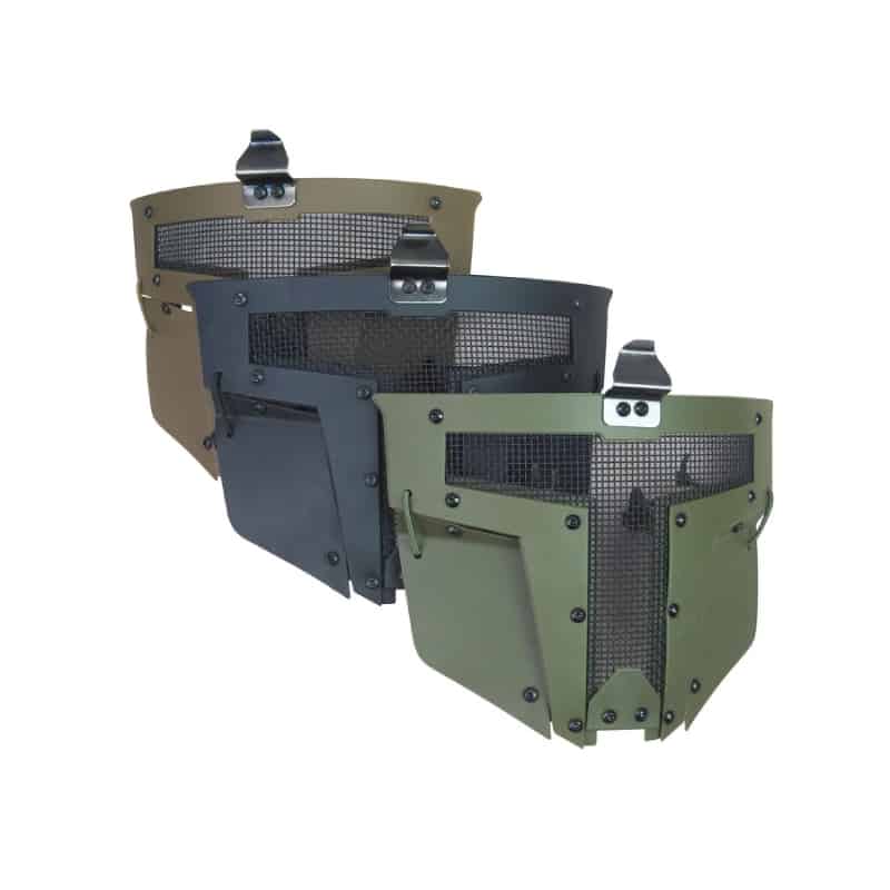 These trojan face masks are designed to fit the Kombat UK fast helmet. They clip into the arc rails and the NVG mount of the helmet to secure it in place. They are available in black, tan and olive. Transform your loadout and rule the battlefield with this Mando inspired face mask with cross steel mesh eye protection.Features: