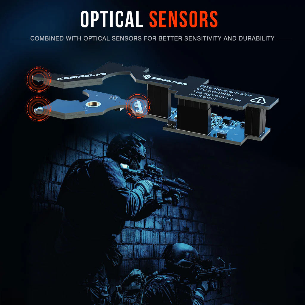 The Kestrel ETU offers a wide range of customisable shooting modes, including Safe, Semi-Automatic, Binary, Burst, AUG, Full-Automatic, and Sniper modes.