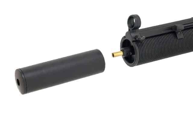 The JG MP5 SD5 is a great airsoft starter AEG with a high-quality Metal upper receiver and an integrated suppressor coming out of the handguard. Due to the metal body, this AEG is very durable and perfect for both woodland and CQB environments. The top of the receiver has the standard mounts for the airsoft MP5 claw mount to allow you to add a Picatinny 20mm rail to attach a sight or scope on top. It comes with the standard fixed front sight ring and an adjustable metal rear sight with four positions. This AEG comes with the fixed position stock which is also the battery compartment big enough for larger capacity batteries. We recommend an 8.4v NiMh battery or a 7.4v 2200MAH LiPo battery for the best performance. It has a metal cocking handle that moves back & forth and locks into place, but does not open a mock bolt. The hop-up lever is located on the left side of the outer barrel and clicks with every position preventing it from coming loose from vibrations and the position makes it easy to adjust out on the field. Included in the box is the JG MP5 SD5 starter AEG, 200 round high cap magazine, cleaning rod & manual.Features: