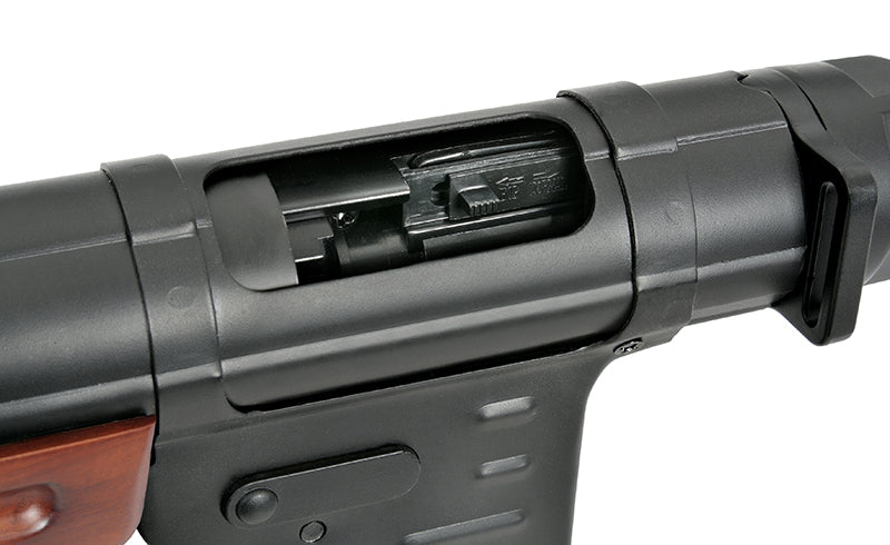 The AGM MP-41 is a high-quality replica of the classic 1941 Maschinenpistole, built for durability and authenticity. It features a robust steel upper receiver with fixed iron sights, ensuring a realistic feel and reliable performance. The lower body and full-size stock are crafted from real wood, providing excellent stability and a classic aesthetic. The metal outer barrel includes a muzzle cap for added realism, while front and rear sling rings allow for easy sling attachment. Additionally, the MP-41 is equipped with a steel movable dummy charging handle, which also functions as a fire selector—when closed, the replica fires in semi-automatic mode, and when open, it switches to full-auto.
