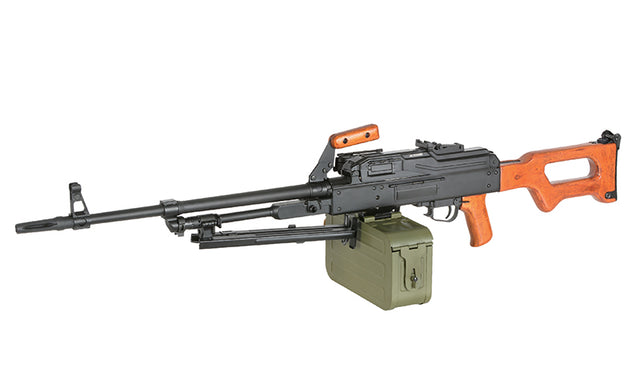 This version features real wood furniture on the handle and stock - with the correct orange hue, this definitely looks the part. A&K have also replicated the PKM's firepower, by means of the included 5000-round, electric-winding box magazine. Simply hook it up to the same battery that powers the gun and you're ready to rock.