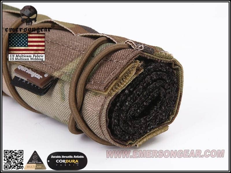 The Emerson Gear Airsoft Suppressor Cover is a good way to make your suppressor look cool and tactical and keep it safe from damage. The cover is made from strong and rugged 500D Cordura® and can be opened and closed using the velcro that runs along two sides. Inside is a softer material to help protect the suppressor from scratches. On the outside is two strips of material that are for threading the elastic cords through. The elastic cords can be adjusted to help retain the suppressor cover in position.Features