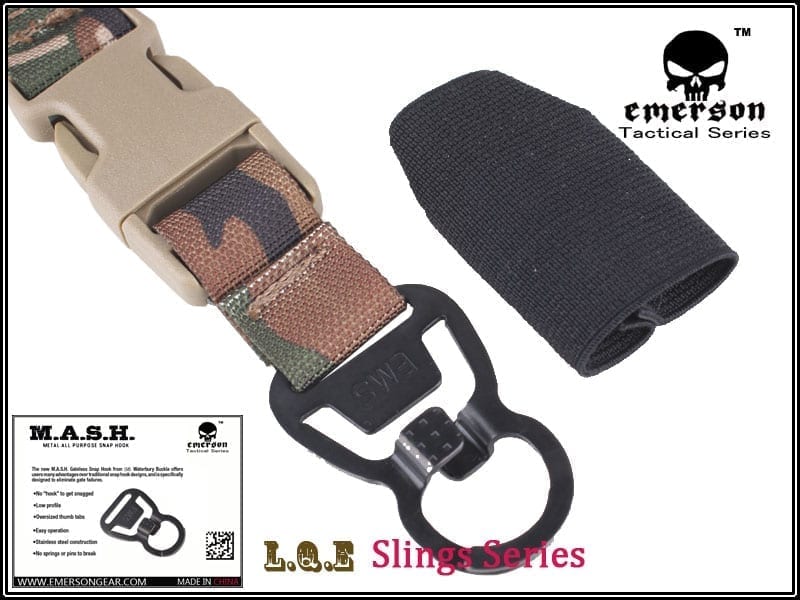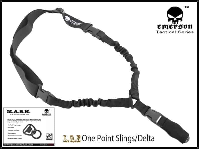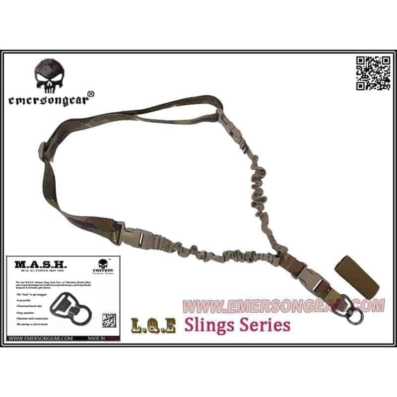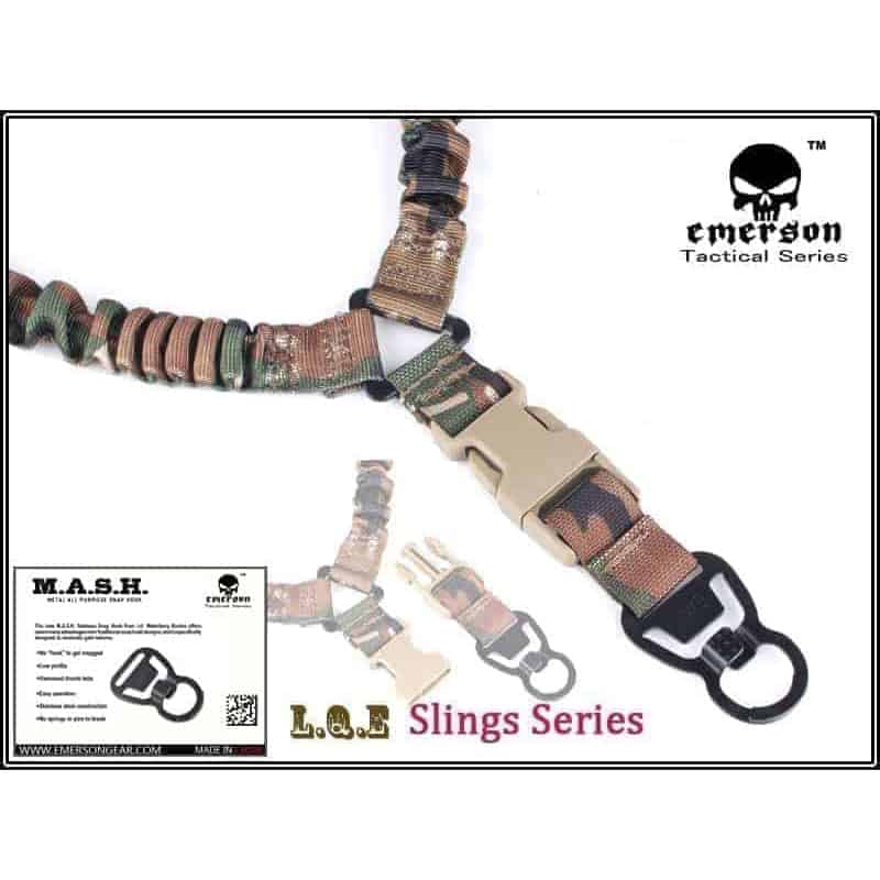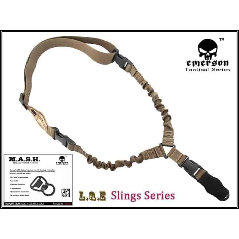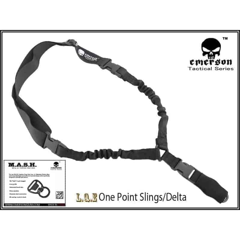 A great choice for a rifle sling, the Emerson Gear Delta LQE single point sling features bungee shock absorption, quick-release buckles and MASH mounting
