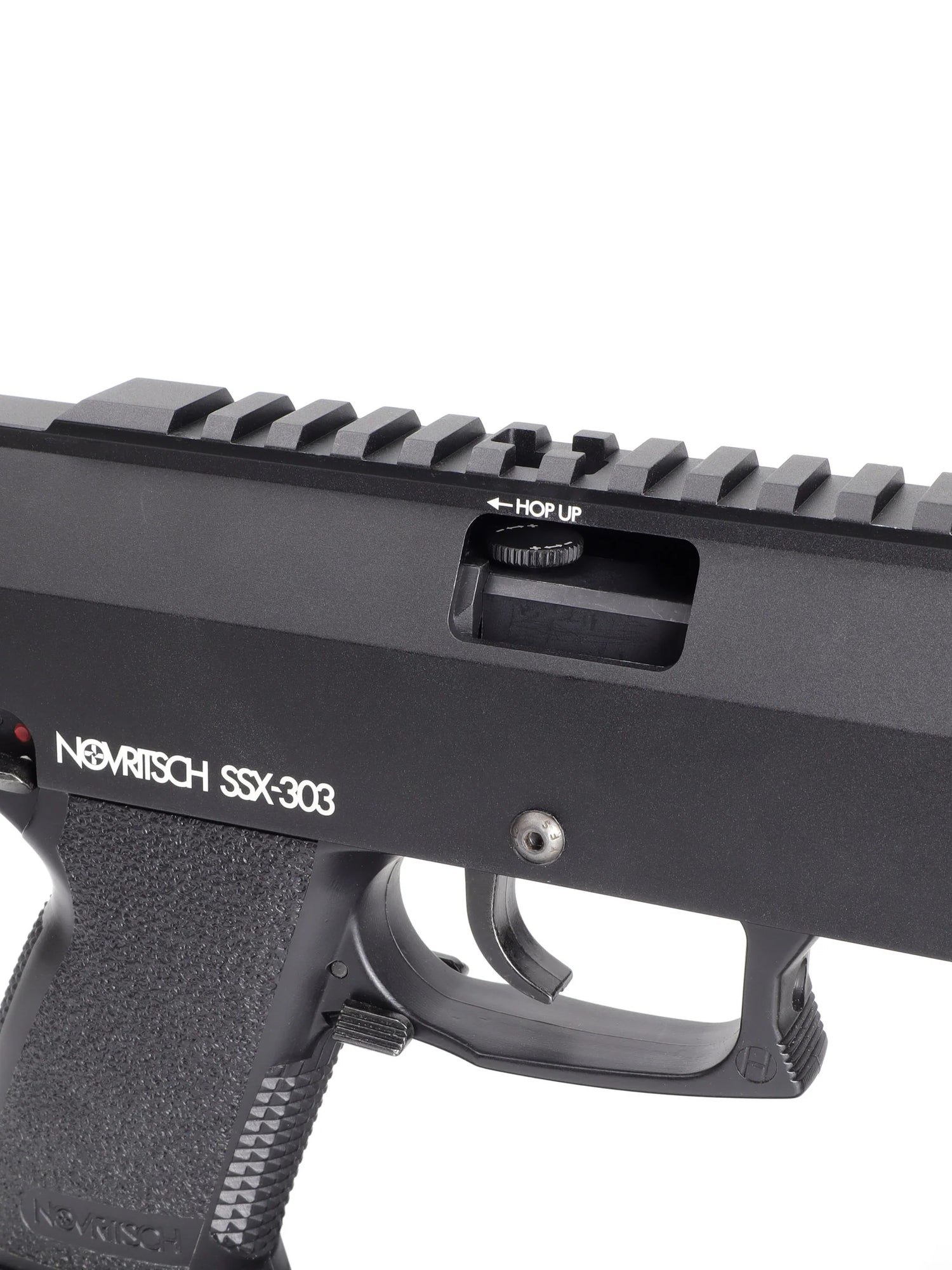 The screw is made out of anodised 6061 aluminum and has laser etched indicator for hop-up adjustment direction. Thumbscrew has knurled sides so you can easily adjust hopup even with gloves.