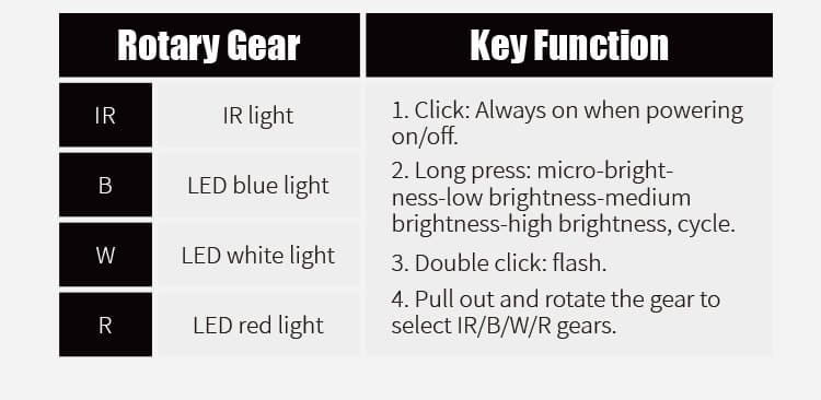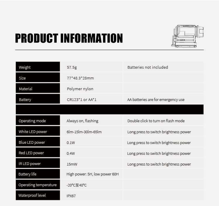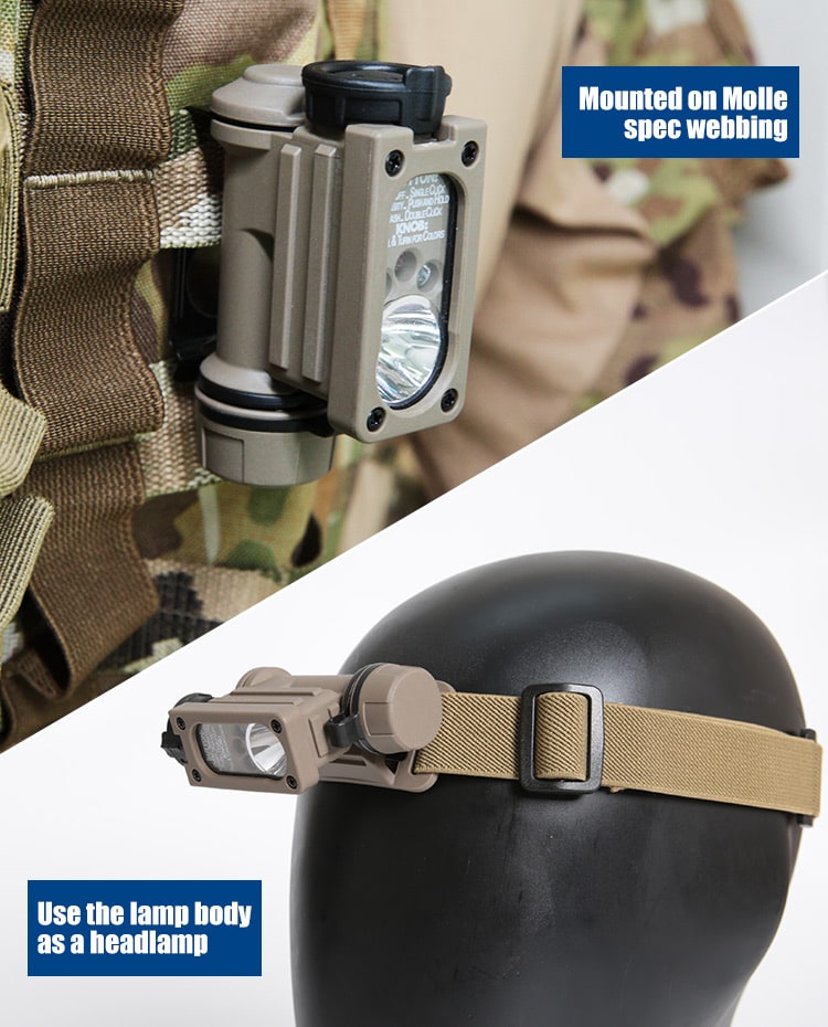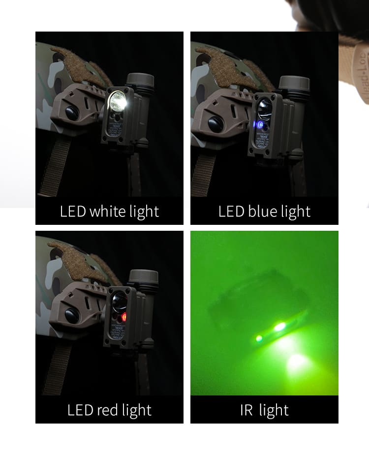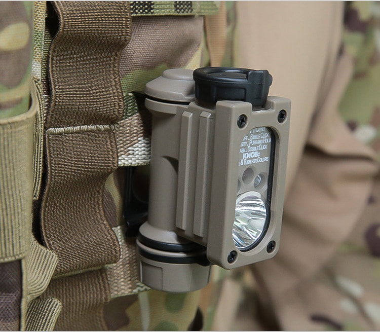 FMA launches new second-generation compact sidewinder survival light, bringing perfect functionality and performance to users. It is made of high-quality nylon polymer material, which provides excellent waterproof and impact resistance, making it safe and reliable to use in various complex environments and conditions. It offers two flashing modes, four light- ing options, and four brightness levels to cater to different needs and task environments. The white LED provides light for daily illumination or marking, the blue LED serves as a light source for rescue or personnel identification due to its wavelength characteristics, the red LED offers light in low-light conditions, and the IR LED can provide close-range illumination or long-distance marking under night vision equipment conditions. All four light sources can be set to flash or stay on continuously, and users can choose any of the four levels according to their specific light intensity requirements. The most remarkable feature of this lamp is that it only has two movable switches, both located in the same position. This is an extreme- ly robust design considering its compact size and weight.
