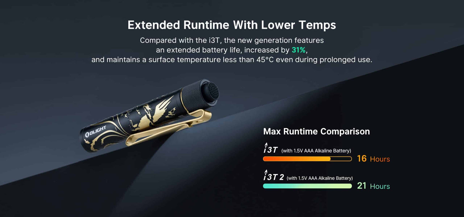 ● Excellent Capacity: A single AAA battery offers the i3T 2 a max power of 200lm output; 10440 rechargeable li-ion battery (not included) is also supported and can boost the light's max output to 300 lumens. ● Brand New Clip: The clip on the i3T 2 is now stuck between the battery cover and the body -- never worry about falling off and it allows for deeper pocket carry.. ● Start At Your Preferred Mode: Both soft and heavy activation can be set default mode by simple operation, making it more obey to your will. ● More Backup With Lower Temp: Compared with the i3T, this 2nd generation gets 31% more battery life, and 71% more runtime in High mode. We optimized the circuit to ensure its surface temperature less than 113*F even during long-time work.