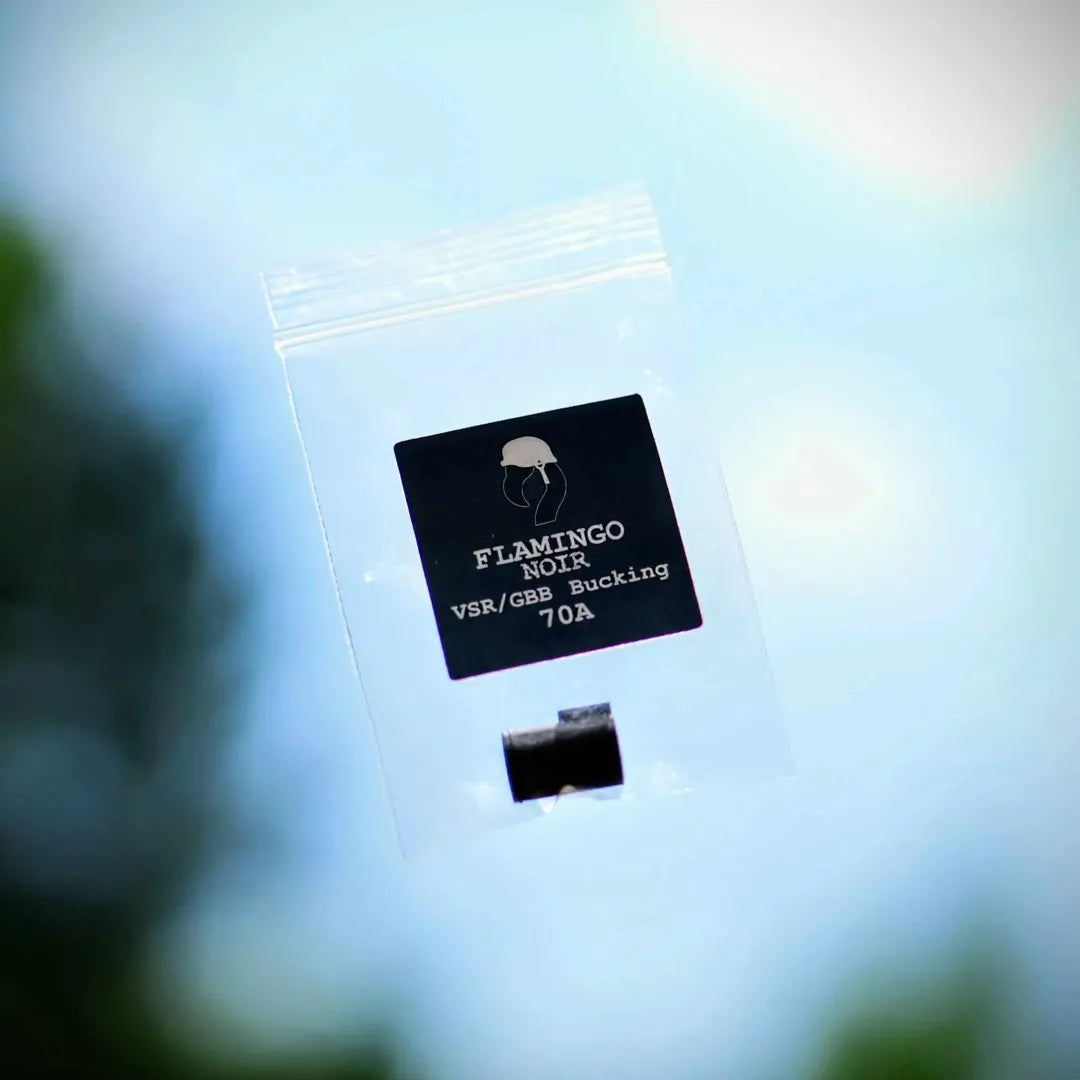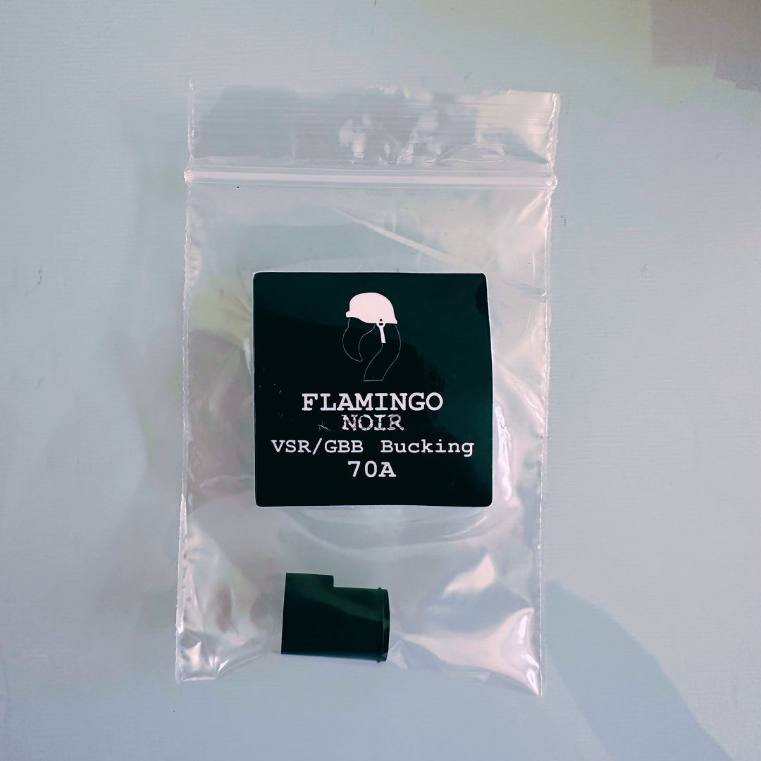 The new Flamingo Noir VSR/GBB bucking from SniperMechanic. This bucking will fit any rifles/pistols that use the VSR/GBB style bucking. This bucking uses the same tried and true design of the Flamingo bucking, but using a NBR based material vs the silicon. This is in part due to people requesting it and also from testing materials in higher power/higher ROF builds.