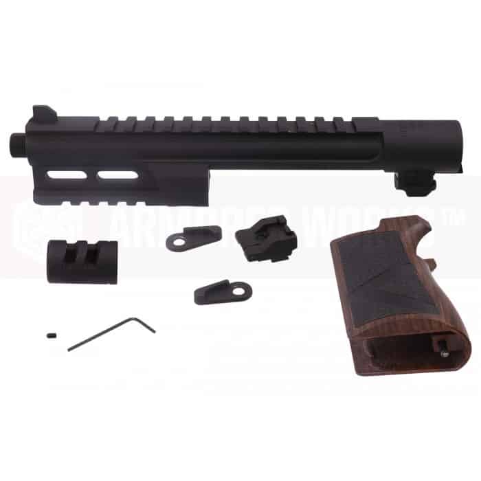 A 10" aluminium conversion kit for the Desert Eagle gas blowback pistols. These kits will fit onto WE/Armorer Works models as well as some of the blowback Cybergun Desert Eagles. The kit includes a threaded outer barrel with 20mm Picatinny rails on the top and bottom, fire selectors, rear sight, compensator and grip set. These kits are great to make your Desert Eagle stand out in the crowd even more!Features: