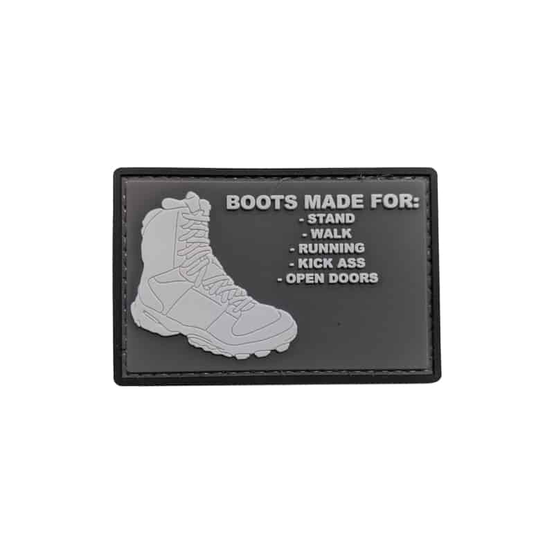 A patch listing all the uses for boots. Approximately 7.5x5cm
