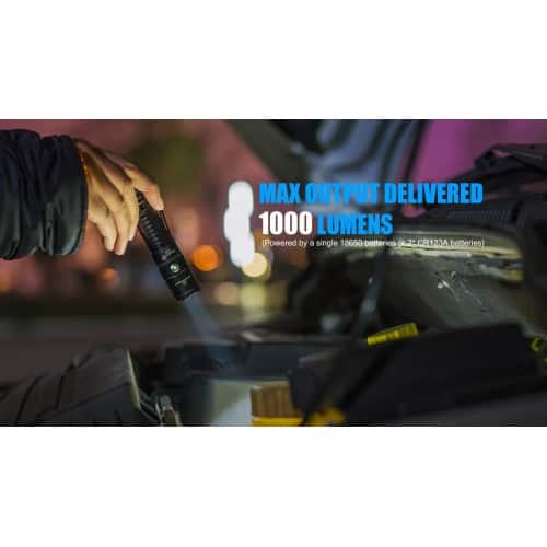 - Super Bright: Max output is 1000 lumens, a compact and super bright flashlight for illuminating dark spots and places. It has 4 modes of High(1000LM)/ Medium(180LM)/Low(5LM)/Strobe modes. You can hold the button for 1.5 seconds under ON status to activate strobe mode.