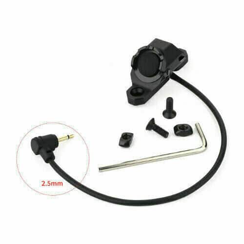 An M-LOK or Keymod mounted angled pressure switch with a 2.5mm plug designed for various illumination accessories. They mount onto your rail system and stick out at an angle for an easier reach when holding your rifle.Features: