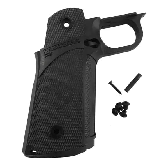 An upgraded lower frame grip for the Tokyo Marui Hi-Capa 5.1 series gas blowback pistol. This is made from polymer and includes 4x grip screws, 1x upper to lower screw and 1x hammer housing retainer pin.Features: