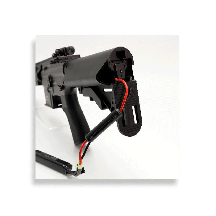 This is a conversion connector with a built-in stock that is compatible with the Tokyo Marui next-generation M4 series electric gun SOPMOD type stock. By using this conversion connector, you can fit a mini connector battery into the stock without any processing.