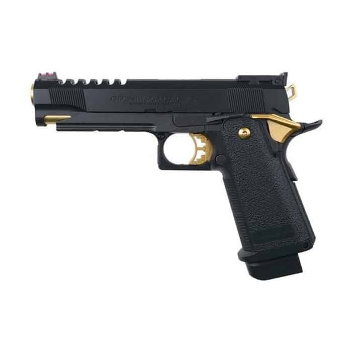 Tokyo Marui Hi-capa 5.1 Gold match The Hi-Capa series by Tokyo Marui is famous in the the airsoft world for being one of the best performing gas blowback pistols of all time. As stock the Hi-Capa is favoured amongst most airsofters and IPSC shooters due to their abiility to be easily upgraded and perform as well as a rifle. Mainly plastic body construction like all TM pistols with main controls like the safety lever, grip safety, slide lock lever etc being constructed of metal.