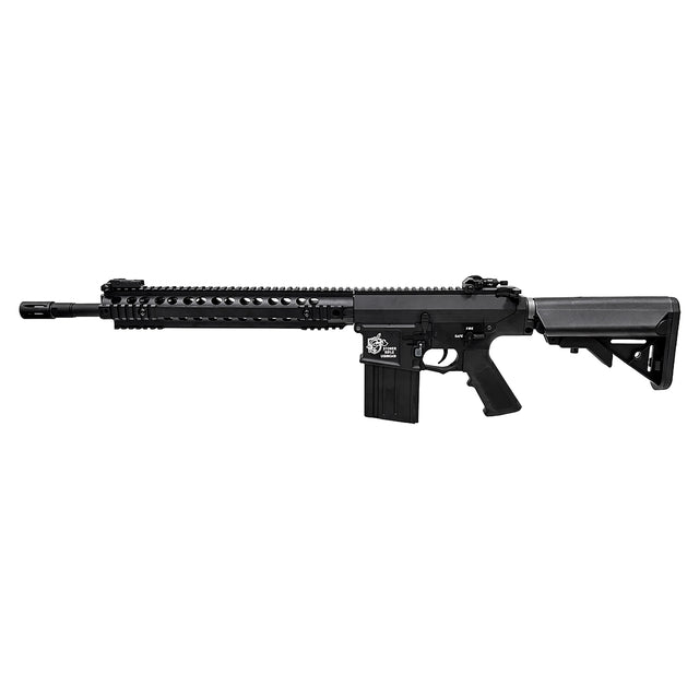 The E&C SR25 AEG has a full metal body along with full laser engraved trademarks, the bolt catch functions giving you the ability to adjust your hop on the fly without having to hold the charging handle back!