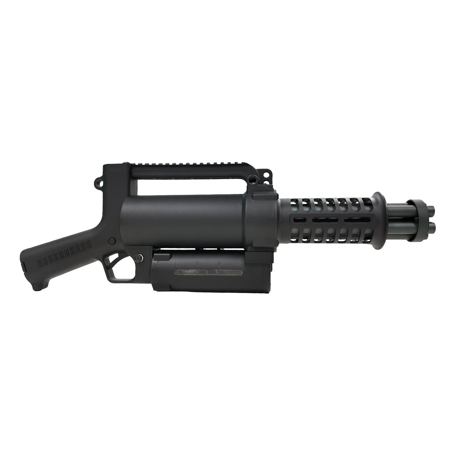 This is a lightweight, handheld minigun designed for the ultimate run, gun and have fun experience. The WE23-S features a 45-degree rear grip and a side-mounted grip up front, prioritising reaction times over pinpoint accuracy.;